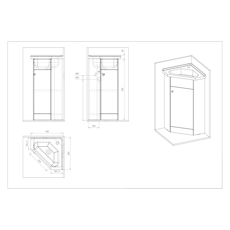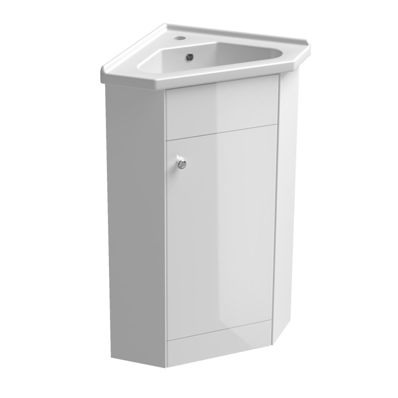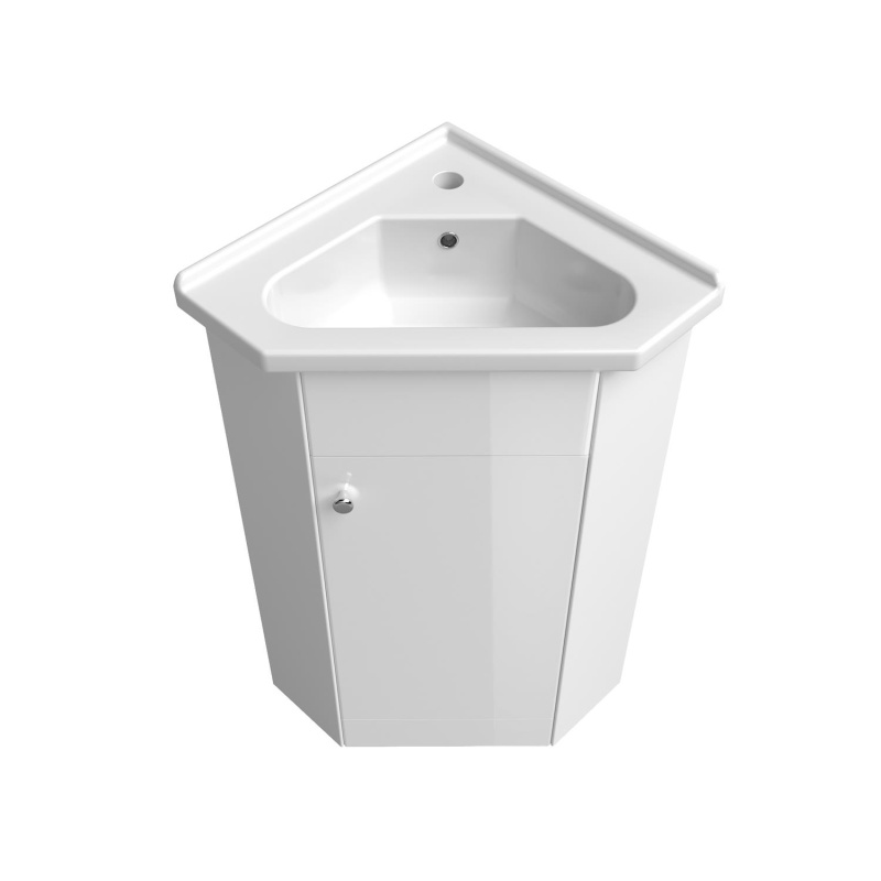The cabinet has enough space for various accessories. In addition to the sink cabinet, the set includes a corner sink with overflow.
