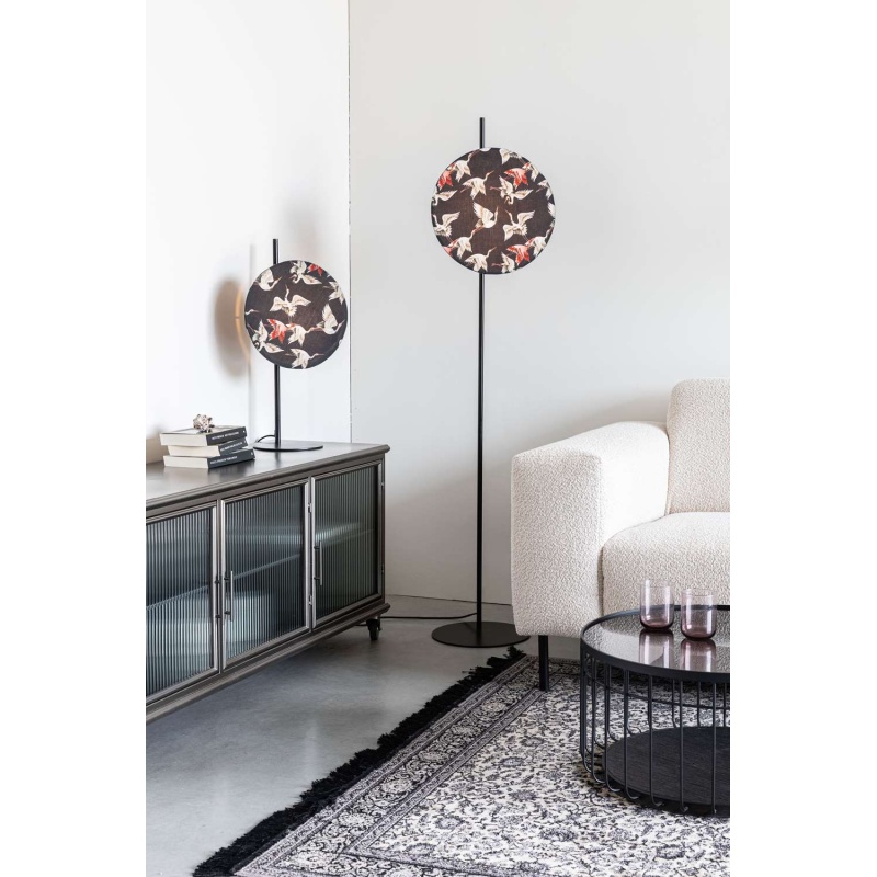| Materjali kirjeldus | Trükitud mustriga puuvillast lambikuppel, matt must pulbervärvitud korpus ja jalg. Puuvillase kattega kaabel On/Off lülitiga. |